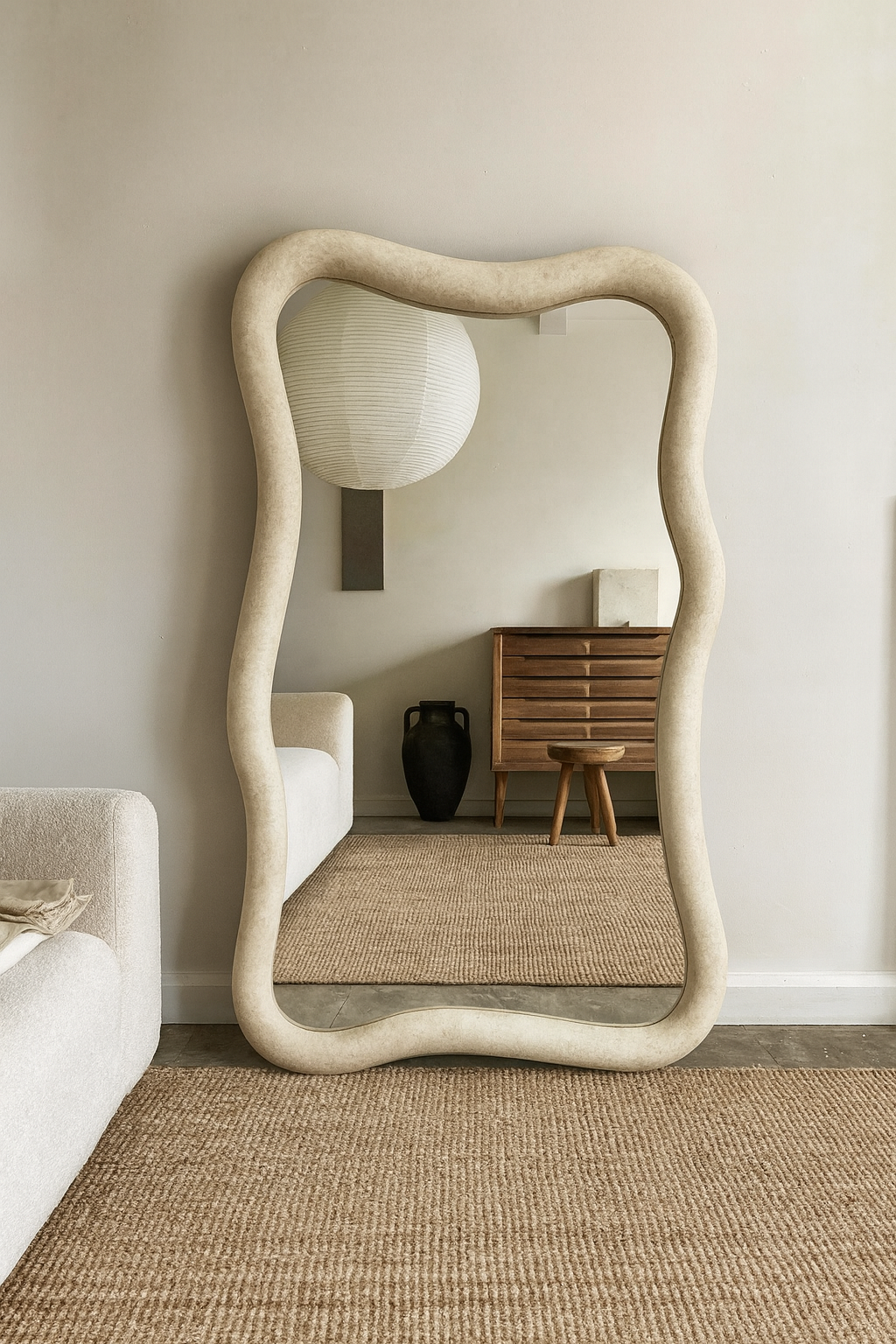 Handcrafted with precision, this full-length mirror celebrates organic imperfection and modern artistry, perfectly balancing playfulness and sophistication. Its generous size (190x110cm) makes it ideal as a floor-leaning mirror or a wall-mounted piece in portrait or landscape orientation, adding depth and texture to bedrooms, living spaces, or entryways.